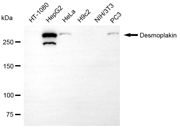 • Western blotting analysis using desmoplakin antibody. Total cell lysates (30 μg) from various cell lines were loaded and separated by SDS-PAGE. The blot was incubated with desmoplakin antibody and HRP-conjugated goat anti-rabbit secondary antibody respectively.