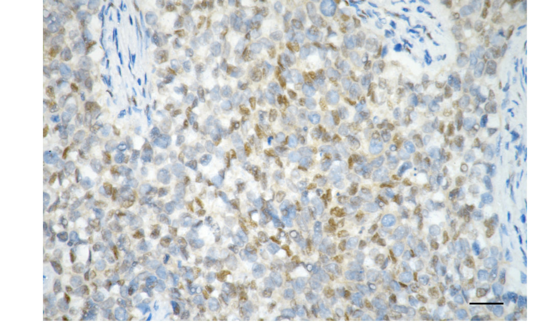 Immunohistochemistry was performed on paraffin-embedded human breast carcinoma using DYNLL1 antibody. Antigen retrieval was done in sodium citrate buffer (pH 6.0). DAB was used for detection, with hematoxylin counterstaining. Images were acquired using a Nikon Ci-L Plus microscope (40× objective). Scale bar: 25 μm.