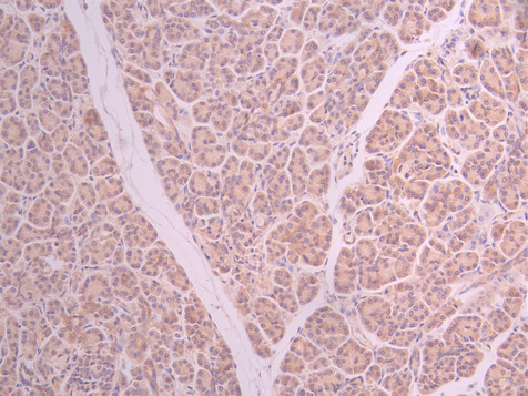 IHC image of CSB-RA909458A0HU diluted at 1:100 and staining in paraffin-embedded human pancreatic tissue performed on a Leica BondTM system. After dewaxing and hydration, antigen retrieval was mediated by high pressure in a citrate buffer (pH 6.0). Section was blocked with 10% normal goat serum 30min at RT. Then primary antibody (1% BSA) was incubated at 4°C overnight. The primary is detected by a Goat anti-rabbit polymer IgG labeled by HRP and visualized using 0.05% DAB.