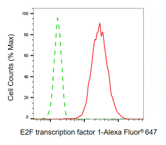 • Flow cytometric analysis of E2F transcription factor 1 expression in C2C12 cells using E2F transcription factor 1 antibody. Green, isotype control; red, E2F transcription factor 1.