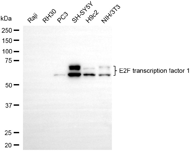 • Western blotting analysis using E2F transcription factor 1 antibody. Total cell lysates (30 μg) from various cell lines were loaded and separated by SDS-PAGE. The blot was incubated with E2F transcription factor 1 antibody and HRP-conjugated goat anti-rabbit secondary antibody respectively.