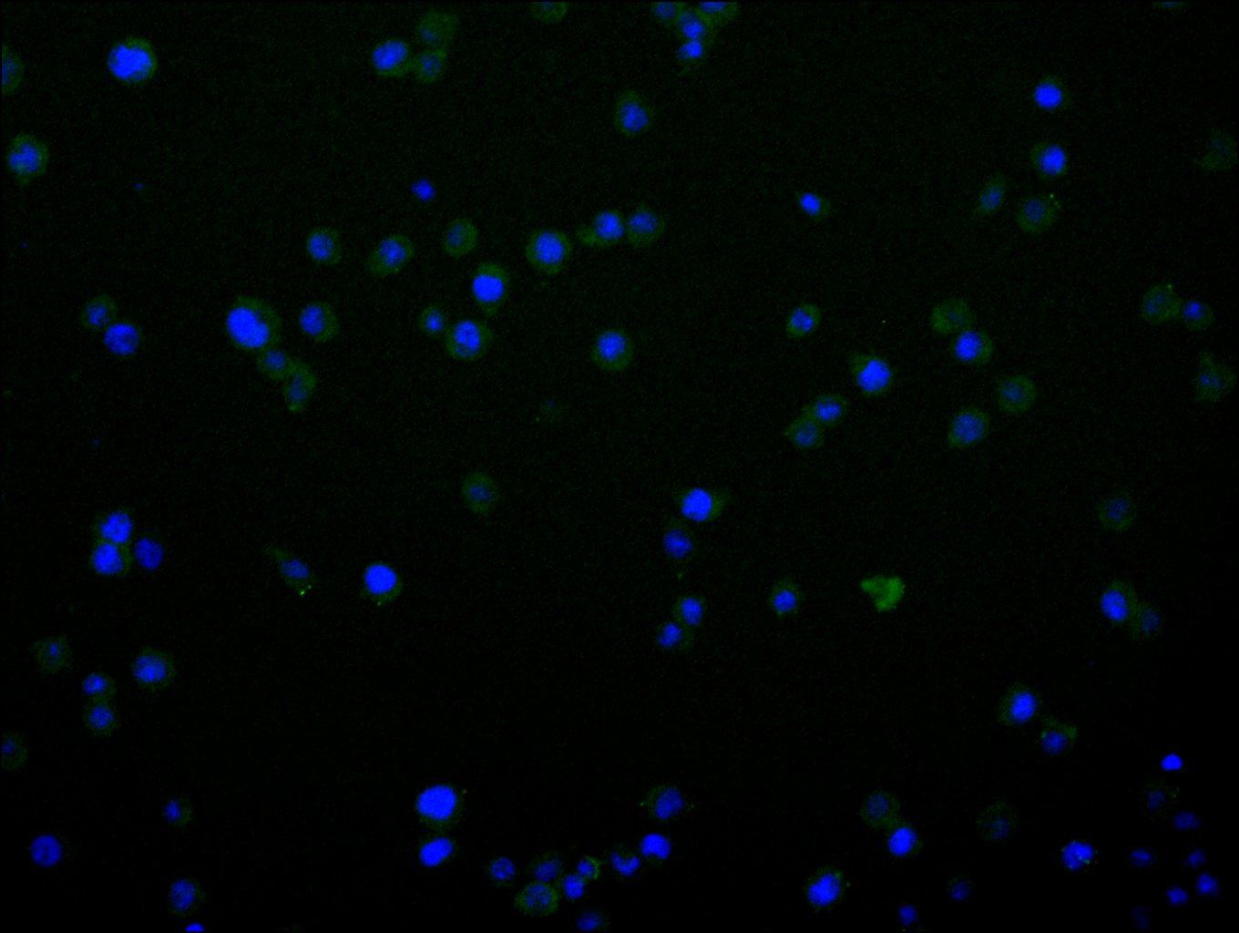 Immunofluorescence staining of Jurkat cell with CSB-RA053731A0HU at 1:50, counter-stained with DAPI. The cells were fixed in 4% formaldehyde, permeabilized using 0.2% Triton X-100 and blocked in 10% normal Goat Serum. The cells were then incubated with the antibody overnight at 4°C. The secondary antibody was Alexa Fluor 488-congugated AffiniPure Goat Anti-Rabbit IgG(H+L).