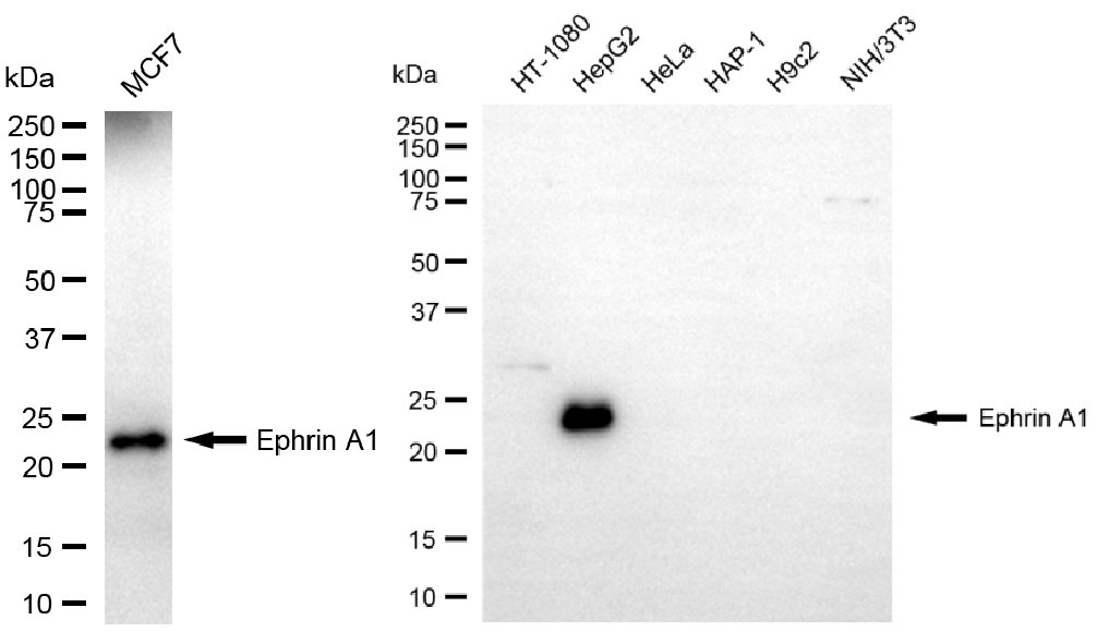 • Western blotting analysis using ephrin A1 antibody. Total cell lysates (30 μg) from various cell lines were loaded and separated by SDS-PAGE. The blot was incubated with ephrin A1 antibody and HRP-conjugated goat anti-rabbit secondary antibody respectively.