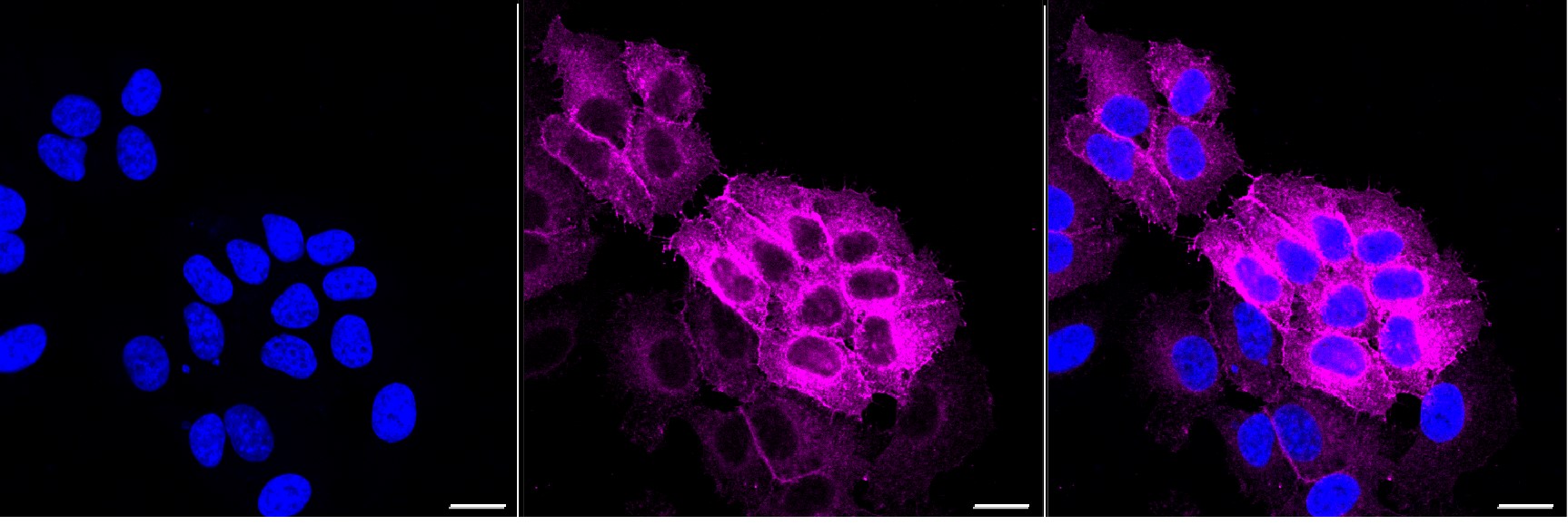 Immunocytochemical staining of HepG2 cells with EGFR antibody. Nuclei were stained blue with DAPI; EGFR was stained magenta with Alexa Fluor? 647. Images were taken using Leica stellaris 5. Protein abundance based on laser Intensity and smart gain: High. Scale bar, 20 μm.