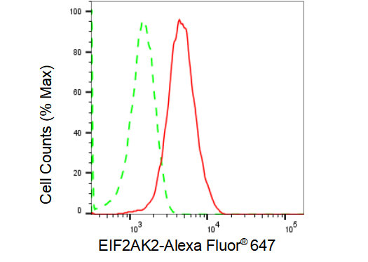 Flow cytometric analysis of EIF2AK2 expression in HepG2 cells using EIF2AK2 antibody. Green, isotype control; red, EIF2AK2.