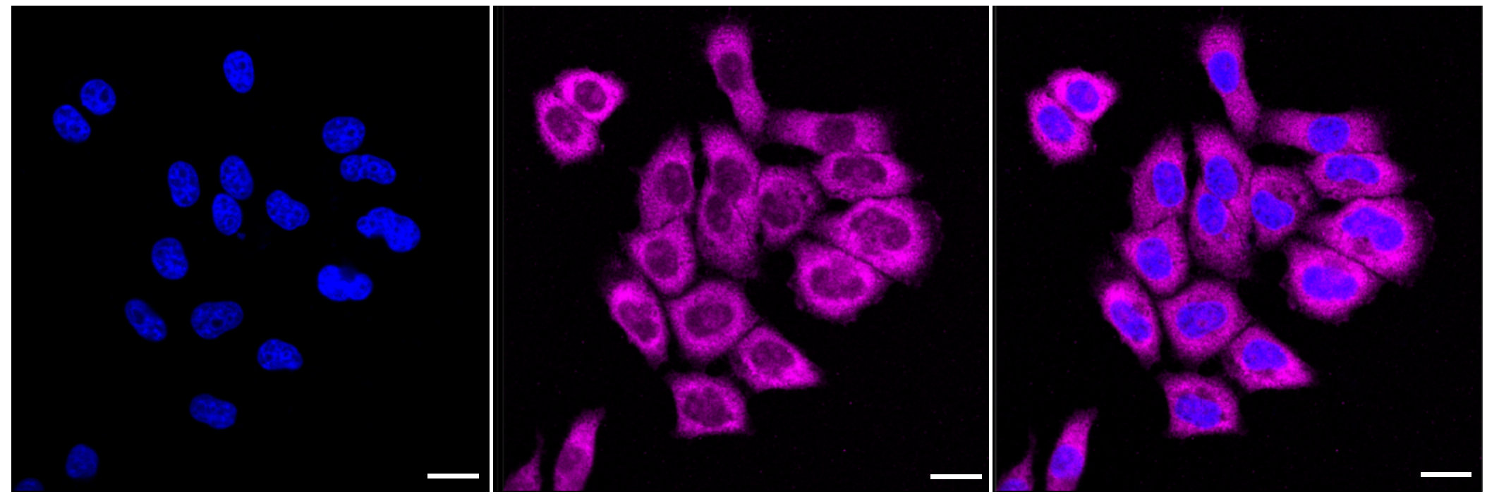 Immunocytochemical staining of HepG2 cells with EIF2AK2 antibody. Nuclei were stained blue with DAPI; EIF2AK2 was stained magenta with Alexa Fluor? 647. Images were taken using Leica stellaris 5. Protein abundance based on laser Intensity and smart gain: High. Scale bar: 20 μm.