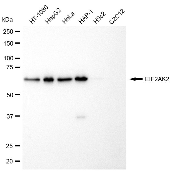 Western blotting analysis using EIF2AK2 antibody. Total cell lysates (30 μg) from various cell lines were loaded and separated by SDS-PAGE. The blot was incubated with EIF2AK2 antibody and HRP-conjugated goat anti-rabbit secondary antibody respectively. EIF2AK2,eukaryotic translation initiation factor 2 alpha kinase 2.
