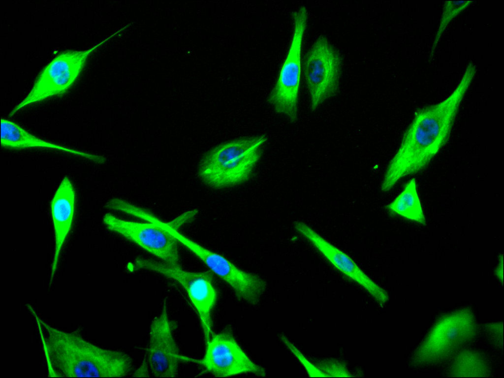 Immunofluorescence staining of PC-3 cell with CSB-RA584416A0HU at 1:50, counter-stained with DAPI. The cells were fixed in 4% formaldehyde, permeabilized using 0.2% Triton X-100 and blocked in 10% normal Goat Serum. The cells were then incubated with the antibody overnight at 4°C. The secondary antibody was Alexa Fluor 488-congugated AffiniPure Goat Anti-Rabbit IgG(H+L).