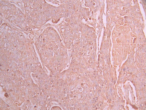 IHC image of CSB-RA584416A0HU diluted at 1:100 and staining in paraffin-embedded human melanoma cancer performed on a Leica BondTM system. After dewaxing and hydration, antigen retrieval was mediated by high pressure in a citrate buffer (pH 6.0). Section was blocked with 10% normal goat serum 30min at RT. Then primary antibody (1% BSA) was incubated at 4°C overnight. The primary is detected by a Goat anti-rabbit polymer IgG labeled by HRP and visualized using 0.05% DAB.