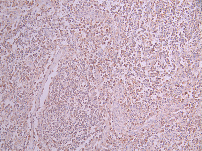 IHC image of CSB-RA584416A0HU diluted at 1:100 and staining in paraffin-embedded human lymph node tissue performed on a Leica BondTM system. After dewaxing and hydration, antigen retrieval was mediated by high pressure in a citrate buffer (pH 6.0). Section was blocked with 10% normal goat serum 30min at RT. Then primary antibody (1% BSA) was incubated at 4°C overnight. The primary is detected by a Goat anti-rabbit polymer IgG labeled by HRP and visualized using 0.05% DAB.