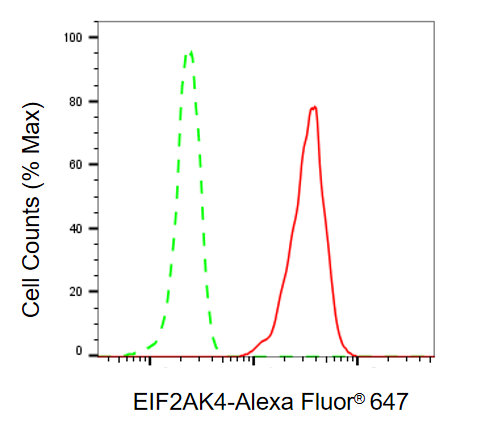 Flow cytometric analysis of EIF2AK4 expression in HT-1080 cells using EIF2AK4 antibody. Green, isotype control; red, EIF2AK4.