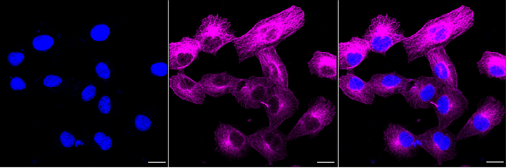 Immunocytochemical staining of HT-1080 cells with EIF2AK4 antibody. Nuclei were stained blue with DAPI; EIF2AK4 was stained magenta with Alexa Fluor? 647. Images were taken using Leica stellaris 5. Protein abundance based on laser Intensity and smart gain: High. Scale bar, 20 μm.