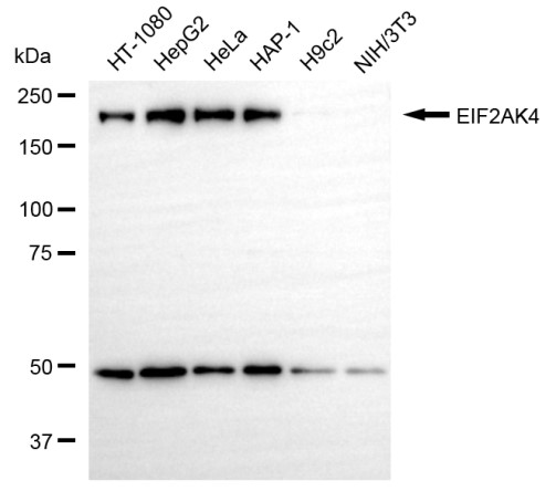Western blotting analysis using EIF2AK4 antibody. Total cell lysates (30 μg) from various cell lines were loaded and separated by SDS-PAGE. The blot was incubated with EIF2AK4 antibody and HRP-conjugated goat anti-rabbit secondary antibody respectively.