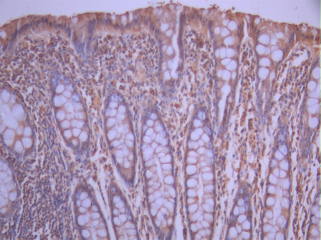 IHC image of CSB-RA249552A0HU diluted at 1:100 and staining in paraffin-embedded human small intestine tissue performed on a Leica BondTM system. After dewaxing and hydration, antigen retrieval was mediated by high pressure in a citrate buffer (pH 6.0). Section was blocked with 10% normal goat serum 30min at RT. Then primary antibody (1% BSA) was incubated at 4°C overnight. The primary is detected by a Goat anti-rabbit polymer IgG labeled by HRP and visualized using 0.05% DAB.