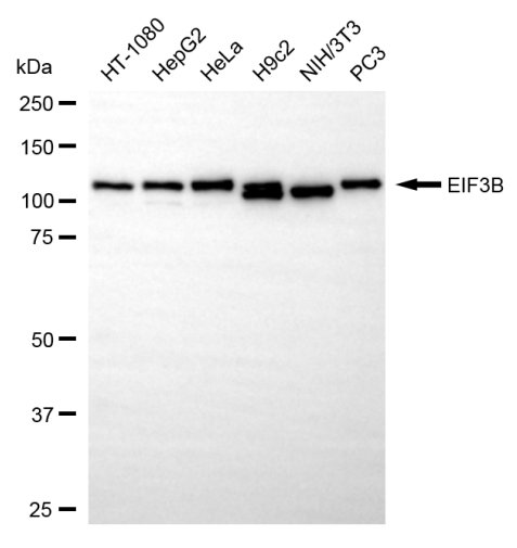 Western blotting analysis using EIF3B antibody. Total cell lysates (30 μg) from various cell lines were loaded and separated by SDS-PAGE. The blot was incubated with EIF3B antibody and HRP-conjugated goat anti-rabbit secondary antibody respectively.