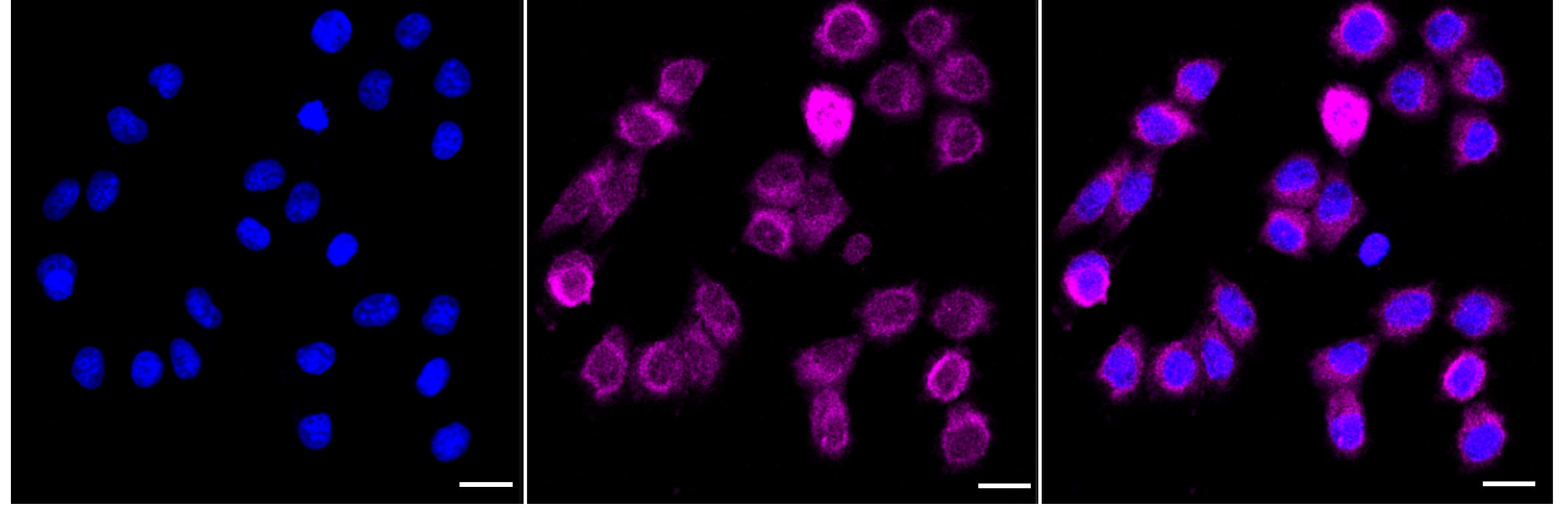 Immunocytochemical staining of HepG2 cells with Eukaryotic translation initiation factor 4E antibody. Nuclei were stained blue with DAPI; Eukaryotic translation initiation factor 4E was stained magenta with Alexa Fluor? 647. Images were taken using Leica stellaris 5. Protein abundance based on laser Intensity and smart gain: Medium. Scale bar: 20 μm.