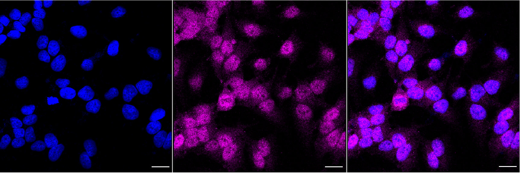 Immunocytochemical staining of Hela cells with TCEB2 antibody. Nuclei were stained blue with DAPI; TCEB2 was stained magenta with Alexa Fluor? 647. Images were taken using Leica stellaris 5. Protein abundance based on laser Intensity and smart gain: Medium. Scale bar, 20 μm.