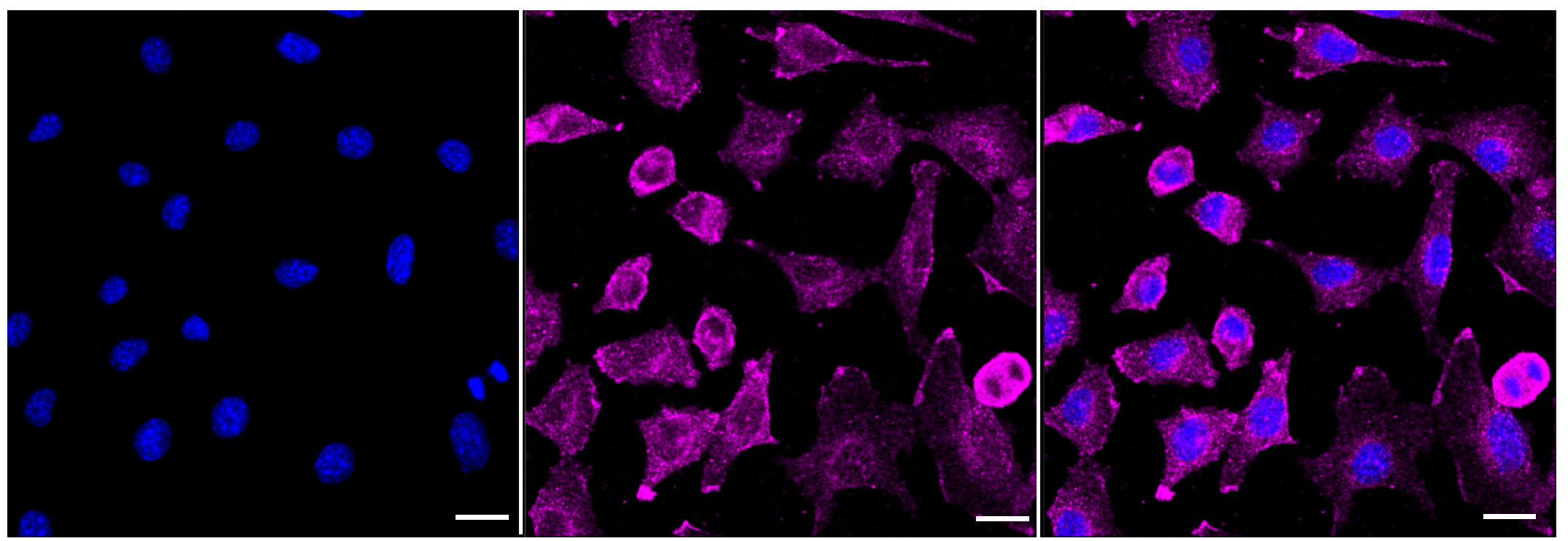 Immunocytochemical staining of C2C12 cells with ELP3 antibody. Nuclei were stained blue with DAPI; ELP3 was stained magenta with Alexa Fluor? 647. Images were taken using Leica stellaris 5. Protein abundance based on laser Intensity and smart gain: Medium. Scale bar: 20 μm.