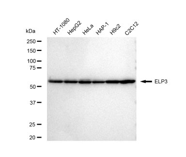 Western blotting analysis using ELP3 antibody. Total cell lysates (30 μg) from various cell lines were loaded and separated by SDS-PAGE. The blot was incubated with ELP3 antibody and HRP-conjugated goat rabbit secondary antibody respectively.