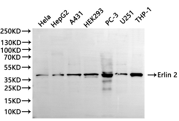 , Positive WB detected in:Hela whole cell lysate(30μg), HepG2 whole cell lysate(30μg), A431 whole cell lysate(30μg), HEK293 whole cell lysate(30μg), PC-3 whole cell lysate(30μg), U251 whole cell lysate(30μg), THP-1 whole cell lysate(30μg)