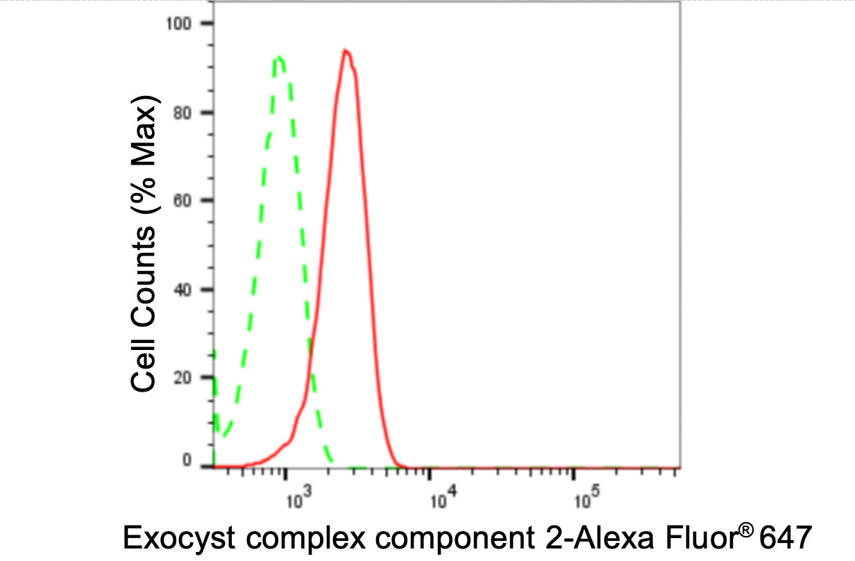 Flow cytometric analysis of Exocyst complex component 2 expression in HepG2 cells using Exocyst complex component 2 antibody. Green, isotype control; red, Exocyst complex component 2.