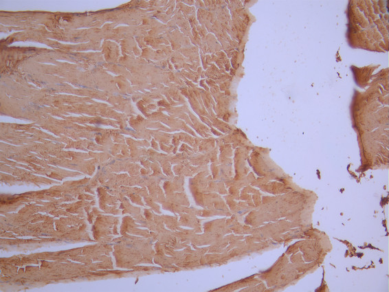 IHC image of CSB-RA008424MA2HU diluted at 1:50 and staining in paraffin-embedded human skeletal muscle tissue performed on a Leica BondTM system. After dewaxing and hydration, antigen retrieval was mediated by high pressure in a citrate buffer (pH 6.0). Section was blocked with 10% normal goat serum 30min at RT. Then primary antibody (1% BSA) was incubated at 4°C overnight. The primary is detected by a Anti-Human lgG, Fcy Fragment Specific labeled by HRP and visualized using 0.05% DAB.