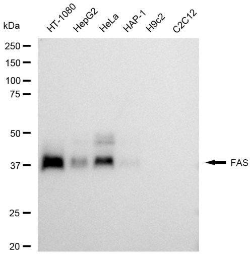 Western blotting analysis using FAS antibody. Total cell lysates (30 μg) from various cell lines were loaded and separated by SDS-PAGE. The blot was incubated with FAS antibody and HRP-conjugated goat rabbit secondary antibody respectively.