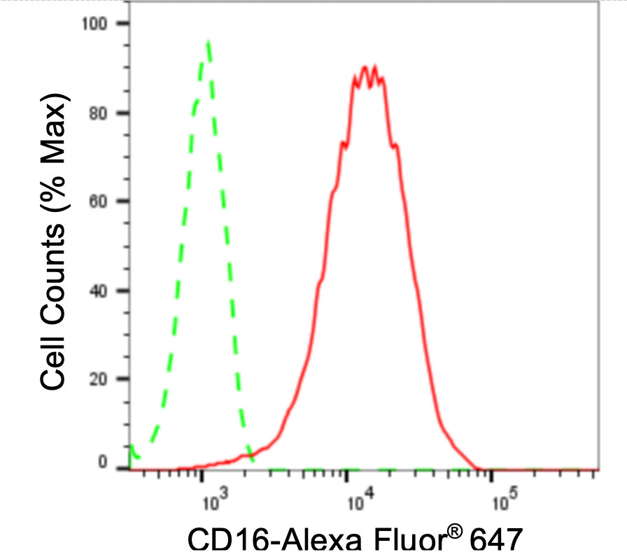 Flow cytometric analysis of CD16 expression in HT-1080 cells using CD16 antibody. Green, isotype control; red, CD16.