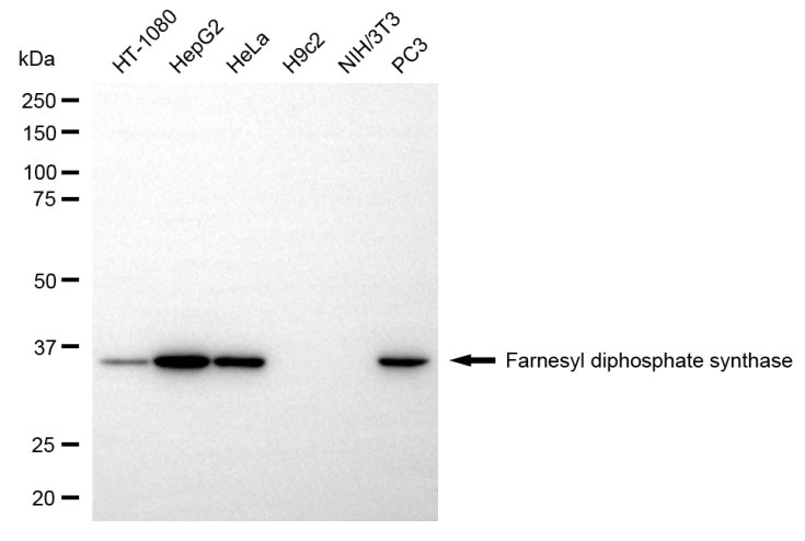 Western blotting analysis using farnesyl diphosphate synthase antibody. Total cell lysates (30 μg) from various cell lines were loaded and separated by SDS-PAGE. The blot was incubated with farnesyl diphosphate synthase antibody and HRP-conjugated goat anti-rabbit secondary antibody respectively.