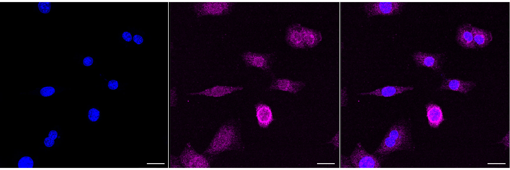 Immunocytochemical staining of C2C12 cells with FOXO1 antibody ,. Nuclei were stained blue with DAPI; FOXO1 was stained magenta with Alexa Fluor? 647. Images were taken using Leica stellaris 5. Protein abundance based on laser Intensity and smart gain: Low. Scale bar, 20 μm.