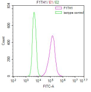 Overlay Peak curve showing 293 cells stained with CSB-RA009030MA1HU (red line) at 1:50. The cells were fixed in 4% formaldehyde (15min) and permeated by 0.2% TritonX-100 for 10min. Then 10% normal goat serum was Incubated to block non-specific protein-protein interactions followed by the antibody (1μg/1*106cells) for 45 min at 4°C. The secondary antibody used was FITC-conjugated Goat Anti-Mouse IgG(H+L) at 1/200 dilution for 35 min at 4°C. Isotype control antibody (green line) was mouse IgG1 (1μg/1*106cells) used under the same conditions. Acquisition of >10,000 events was performed.