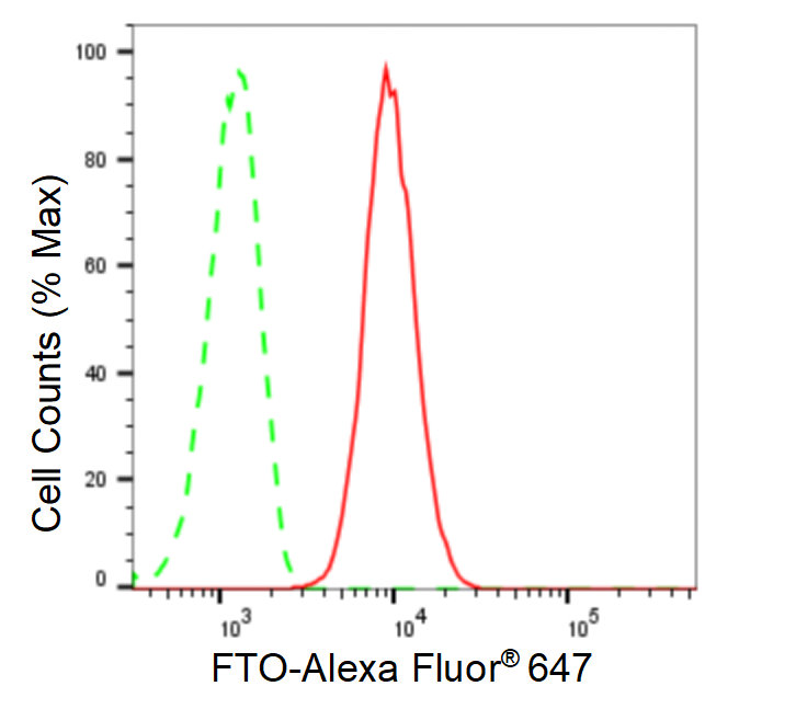 Flow cytometric analysis of FTO expression in HepG2 cells using FTO antibody. Green, isotype control; red, FTO.