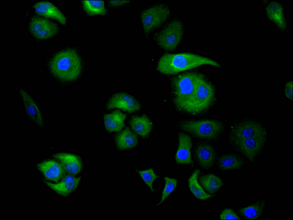 • Immunofluorescence staining of Hela cell with CSB-RA162896A0HU at 1:50, counter-stained with DAPI. The cells were fixed in 4% formaldehyde, permeabilized using 0.2% Triton X-100 and blocked in 10% normal Goat Serum. The cells were then incubated with the antibody overnight at 4°C. The secondary antibody was Alexa Fluor 488-congugated AffiniPure Goat Anti-Rabbit IgG(H+L).