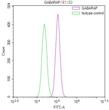 • Overlay Peak curve showing PC-3 cells stained with CSB-RA546399A0HU (red line) at 1:100. The cells were fixed in 4% formaldehyde and permeated by 0.2% TritonX-100 for 10min. Then 10% normal goat serum to block non-specific protein-protein interactions followed by the antibody (1ug/1*106cells) for 45min at 4℃. The secondary antibody used was FITC-conjugated goat anti-rabbit IgG (H+L) at 1/200 dilution for 35min at 4℃.Control antibody (green line) was Rabbit IgG (1ug/1*106cells) used under the same conditions. Acquisition of >10,000 events was performed.