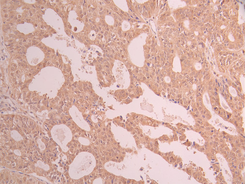 • IHC image of CSB-RA546399A0HU diluted at 1:100 and staining in paraffin-embedded human ovarian cancer performed on a Leica BondTM system. After dewaxing and hydration, antigen retrieval was mediated by high pressure in a citrate buffer (pH 6.0). Section was blocked with 10% normal goat serum 30min at RT. Then primary antibody (1% BSA) was incubated at 4°C overnight. The primary is detected by a Goat anti-rabbit polymer IgG labeled by HRP and visualized using 0.05% DAB.