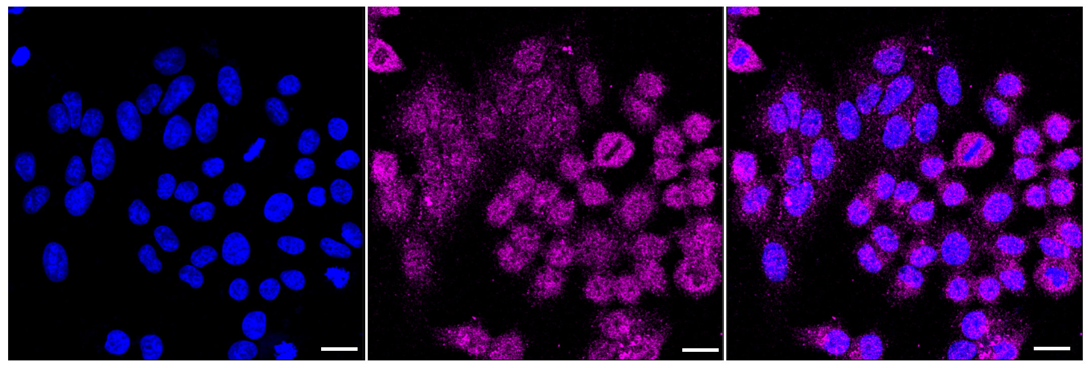 Immunocytochemical staining of HepG2 cells with GABARAP antibody. Nuclei were stained blue with DAPI; GABARAP was stained magenta with Alexa Fluor? 647. Images were taken using Leica stellaris 5. Protein abundance based on laser Intensity and smart gain: Low. Scale bar, 20 μm.