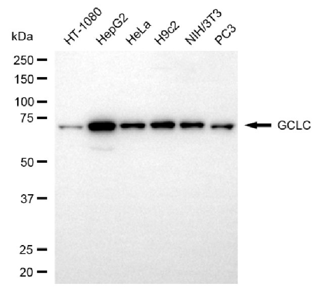 • Western blotting analysis using GCLC antibody. Total cell lysates (30 μg) from various cell lines were loaded and separated by SDS-PAGE. The blot was incubated with GCLC antibody and HRP-conjugated goat anti-rabbit secondary antibody respectively.