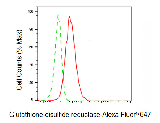 Flow cytometric analysis of Glutathione-disulfide reductase expression in HeLa cells using Glutathione-disulfide reductase antibody. Green, isotype control; red, Glutathione-disulfide reductase.