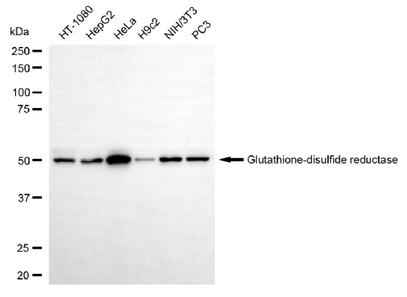 Western blotting analysis using glutathione-disulfide reductase antibody. Total cell lysates (30 μg) from various cell lines were loaded and separated by SDS-PAGE. The blot was incubated with glutathione-disulfide reductase antibody and HRP-conjugated goat anti-rabbit secondary antibody respectively.