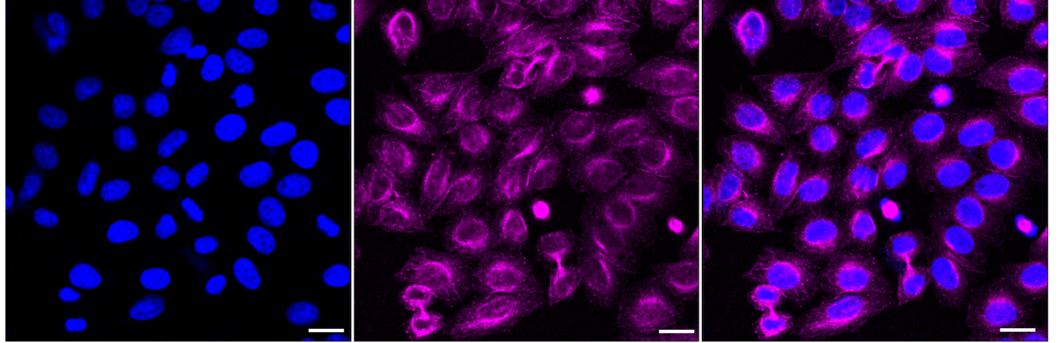 Immunocytochemical staining of HepG2 cells with Phospho-Histone H2A.X (S139) antibody. Nuclei were stained blue with DAPI; Phospho-Histone H2A.X (S139) was stained magenta with Alexa Fluor? 647. Images were taken using Leica stellaris 5. Protein abundance based on laser Intensity and smart gain: Medium. Scale bar: 20 μm.