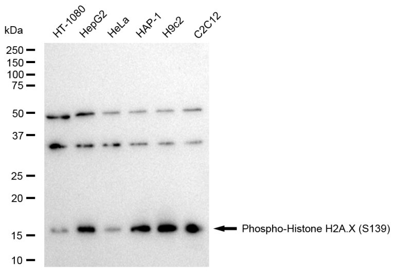 Western blotting analysis using Phospho-Histone H2A.X (S139) antibody. Total cell lysates (5 μg) from various cell lines were loaded and separated by SDS-PAGE. The blot was incubated with Phospho-Histone H2A.X (S139) antibody and HRP-conjugated goat anti-rabbit secondary antibody respectively.