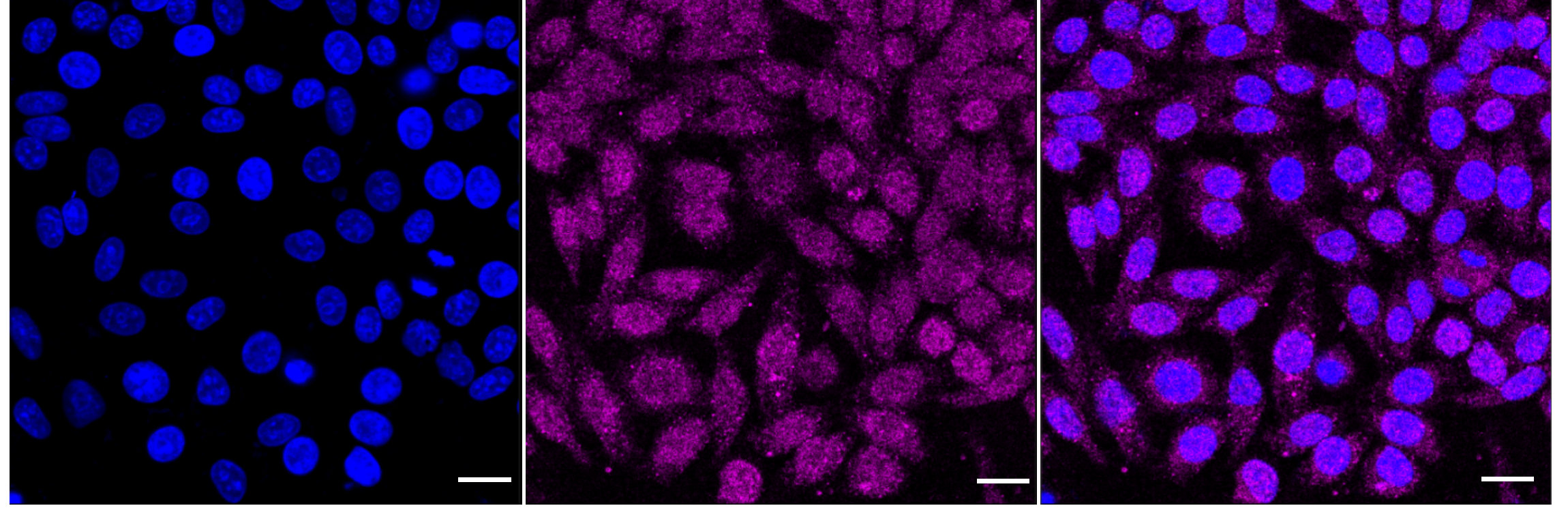 • Immunocytochemical staining of HepG2 cells with Histone H2B antibody. Nuclei were stained blue with DAPI; Histone H2B was stained magenta with Alexa Fluor? 647. Images were taken using Leica stellaris 5. Protein abundance based on laser Intensity and smart gain: Medium. Scale bar: 20 μm.