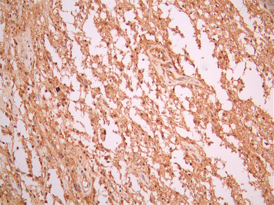 IHC image of CSB-RA189750A0HU diluted at 1:100 and staining in paraffin-embedded human glioma cancer performed on a Leica BondTM system. After dewaxing and hydration, antigen retrieval was mediated by high pressure in a citrate buffer (pH 6.0). Section was blocked with 10% normal goat serum 30min at RT. Then primary antibody (1% BSA) was incubated at 4°C overnight. The primary is detected by a Goat anti-rabbit polymer IgG labeled by HRP and visualized using 0.05% DAB.