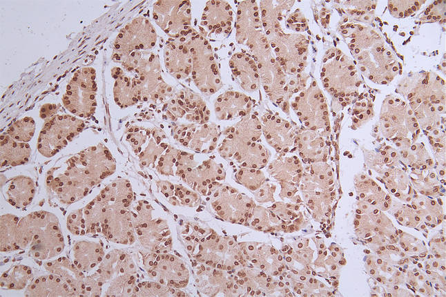 • IHC image of CSB-RA072684A0HU diluted at 1:50 and staining in paraffin-embedded human stomach tissue performed on a Leica BondTM system. After dewaxing and hydration, antigen retrieval was mediated by high pressure in a citrate buffer (pH 6.0). Section was blocked with 10% normal goat serum 30min at RT. Then primary antibody (1% BSA) was incubated at 4°C overnight. The primary is detected by a Goat anti-rabbit polymer IgG labeled by HRP and visualized using 0.32% DAB.