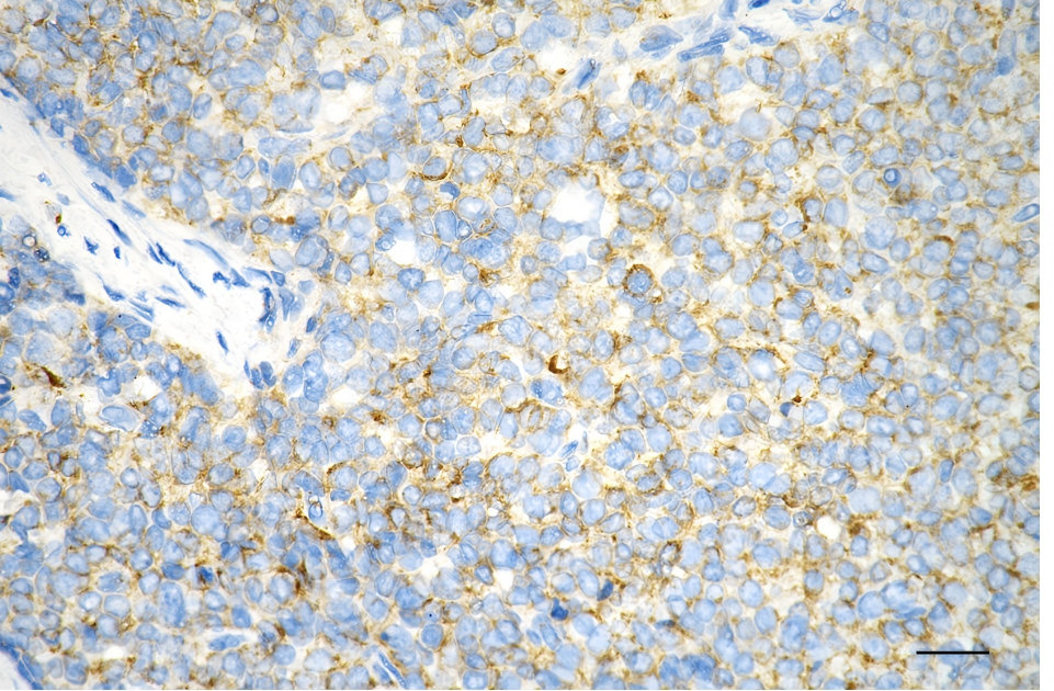 Immunohistochemistry was performed on paraffin-embedded human breast carcinoma using hexokinase 1 antibody. Antigen retrieval was done in sodium citrate buffer (pH 6.0). DAB was used for detection, with hematoxylin counterstaining. Images were acquired using a Nikon Ci-L Plus microscope (40× objective). Scale bar: 25 μm.