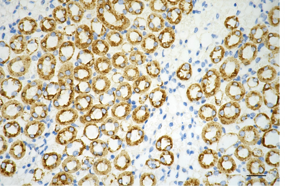Immunohistochemistry was performed on paraffin-embedded mouse kidney using hexokinase 1 antibody. Antigen retrieval was done in sodium citrate buffer (pH 6.0). DAB was used for detection, with hematoxylin counterstaining. Images were acquired using a Nikon Ci-L Plus microscope (40× objective). Scale bar: 25 μm.