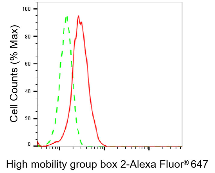 Flow cytometric analysis of High mobility group box 2 expression in HepG2 cells using High mobility group box 2 antibody. Green, isotype control; red, High mobility group box 2.