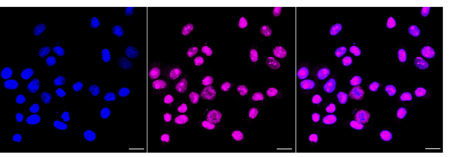 Immunocytochemical staining of HepG2 cells with High mobility group box 2?antibody. Nuclei were stained blue with DAPI; High mobility group box 2?was stained magenta with Alexa Fluor? 647. Images were taken using Leica stellaris 5. Protein abundance based on laser Intensity and smart gain: Medium. Scale bar, 20 μm.