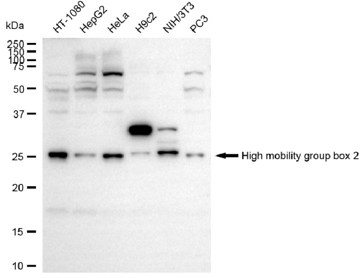Western blotting analysis using high mobility group box 2 antibody. Total cell lysates (30 μg) from various cell lines were loaded and separated by SDS-PAGE. The blot was incubated with high mobility group box 2 antibody and HRP-conjugated goat anti-rabbit secondary antibody respectively.