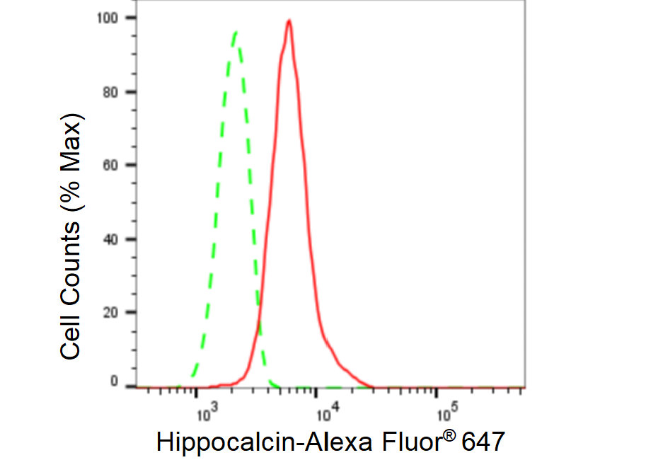 Flow cytometric analysis of Hippocalcin expression in HepG2 cells using Hippocalcin antibody. Green, isotype control; red, Hippocalcin.